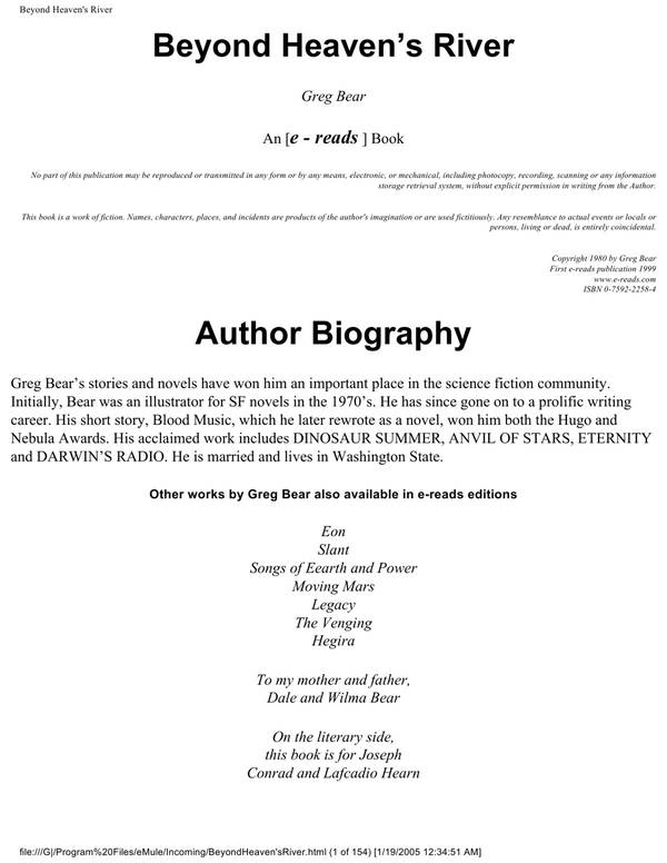 Initially, Bear was an illustrator for SF novels in the 1970’s. He has since gone on to a prolific writing career. His short story, Blood Music, which he later rewrote as a novel, won him both the Hugo and Nebula Awards. His acclaimed work includes DINOSAUR SUMMER, ANVIL OF STARS, ETERNITY