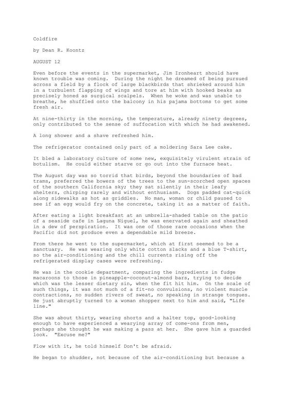 Even before the events in the supermarket, Jim Ironheart should have known trouble was coming. During the night he dreamed of being pursued across a field by a flock of large blackbirds that shrieked around him in a turbulent flapping of wings and tore at him with hooked beaks as precisely honed as surgical scalpels. When he woke and was unable to breathe, he shuffled onto the balcony in his pajama bottoms to get some fresh air.