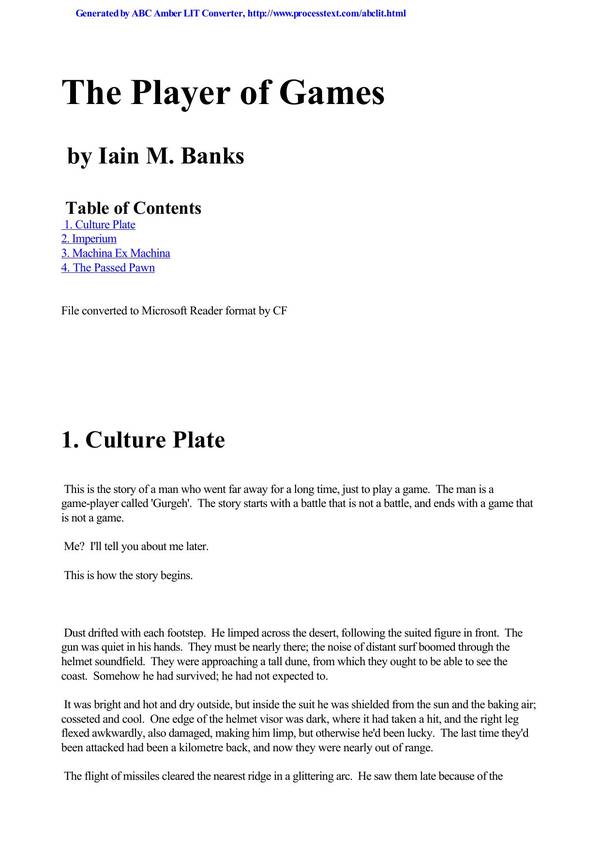 This is the story of a man who went far away for a long time, just to play a game. The man is a game-player called ‘Gurgeh’. The story starts with a battle that is not a battle, and ends with a game that is not a game.