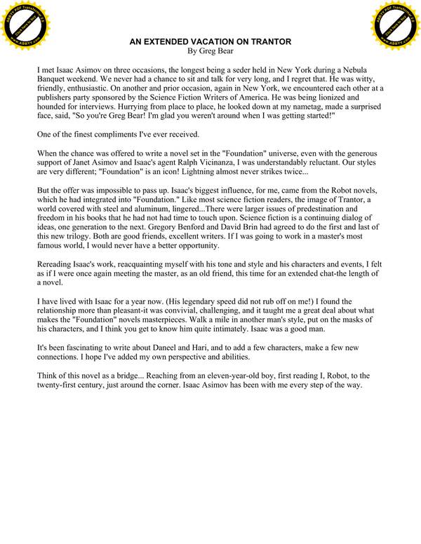 But the offer was impossible to pass up. Isaac’s biggest influence, for me, came from the Robot novels, which he had integrated into “Foundation.” Like most science fiction readers, the image of Trantor, a world covered with steel and aluminum, lingered…There were larger issues of predestination and freedom in his books that he had not had time to touch upon. Science fiction is a continuing dialog of ideas, one generation to the next. Gregory Benford and David Brin had agreed to do the first and last of this new trilogy. Both are good friends, excellent writers. If I was going to work in a master’s most famous world, I would never have a better opportunity.