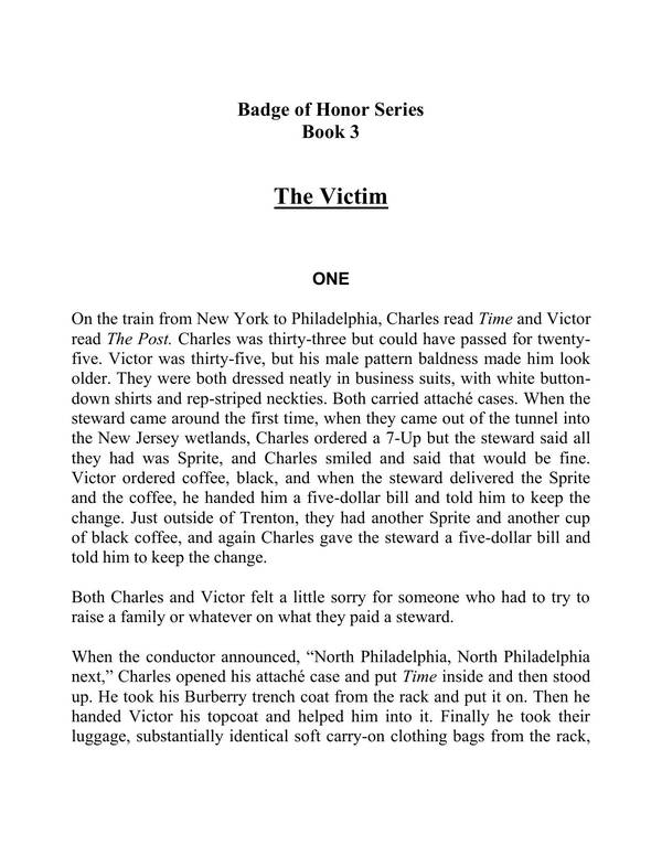 On the train from New York to Philadelphia, Charles read Time and Victor read The Post. Charles was thirty-three but could have passed for twenty-five. Victor was thirty-five, but his male pattern baldness made him look older. They were both dressed neatly in business suits, with white button-down shirts and rep-striped neckties. Both carried attaché cases. When the steward came around the first time, when they came out of the tunnel into the New Jersey wetlands, Charles ordered a 7-Up but the steward said all they had was Sprite, and Charles smiled and said that would be fine.