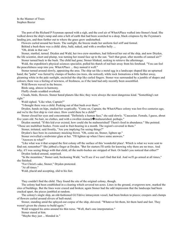 The port of the Richard P Feynman opened with a sigh, and the cool air of WhatAPlace wafted into Stoner’s head. She walked down the ship’s ramp and onto a belt of earth that had been scorched to a deep, black crispness by the Feynman’s landing jets, and then further out to where the grass grew undisturbed.