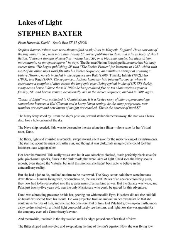 “Lakes of Light” was published in Constellations. It is a Xeelee story of alien supertechnology, somewhere between a Hal Clement and a Larry Niven setting. As the story progresses, new wonders are seen and new layers of insight are reached. This is the essence of hard SF