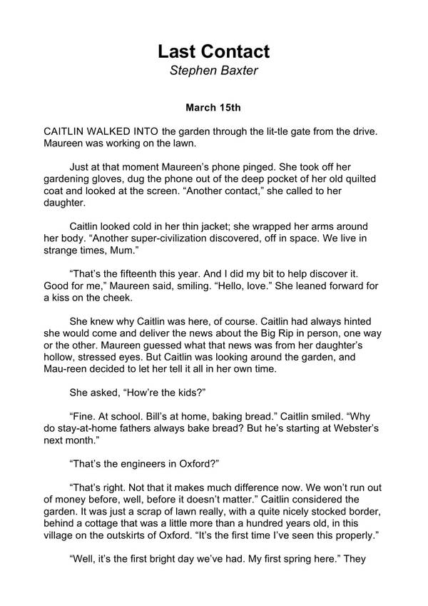 She knew why Caitlin was here, of course. Caitlin had always hinted she would come and deliver the news about the Big Rip in person, one way or the other. Maureen guessed what that news was from her daughter’s hollow, stressed eyes. But Caitlin was looking around the garden, and Mau-reen decided to let her tell it all in her own time.