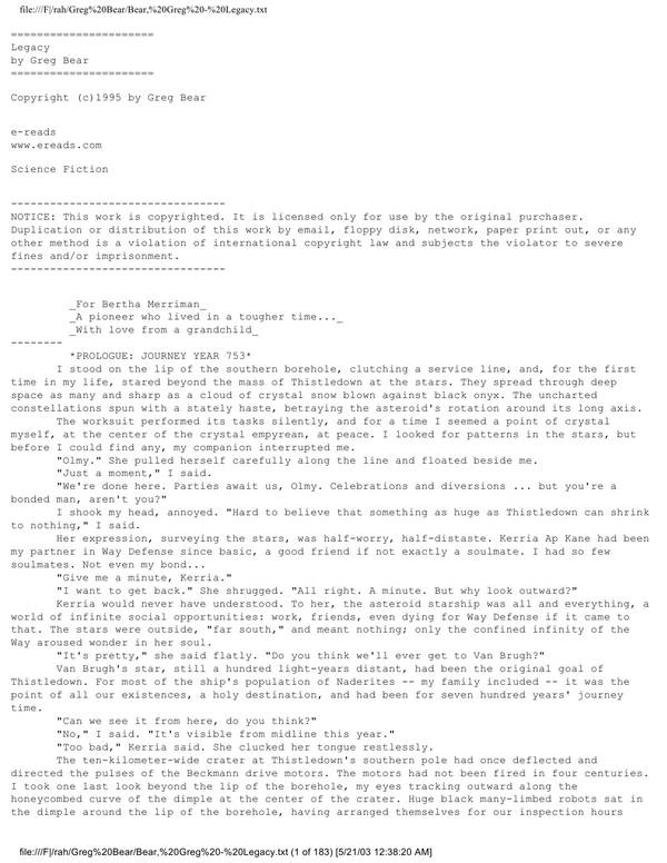 I stood on the lip of the southern borehole, clutching a service line, and, for the first time in my life, stared beyond the mass of Thistledown at the stars. They spread through deep space as many and sharp as a cloud of crystal snow blown against black onyx. The uncharted constellations spun with a stately haste, betraying the asteroid’s rotation around its long axis.