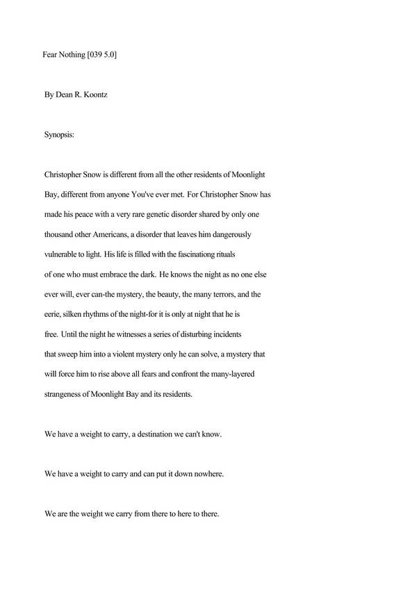 Book Preview Copyright @ 1995 by Dean R. Koontz. This book is for Florence Koontz. MY mother. Long lost. My guardian. Hope is the destination that we seek. Love is the road that leads to hope. Courage is the motor that drives us. We travel out of darkness into faith. -THE BOOK OF COUNTED SORROWS … Read more