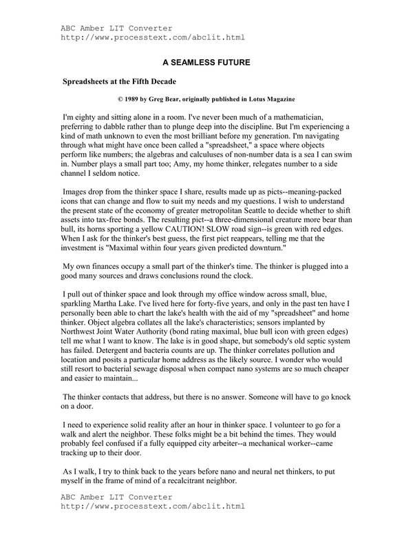 Book Preview http://www.processtext.com/abclit.html Spreadsheets at the Fifth Decade © 1989 by Greg Bear, originally published in Lotus Magazine I’m eighty and sitting alone in a room. I’ve never been much of a mathematician, preferring to dabble rather than to plunge deep into the discipline. But I’m experiencing a kind of math unknown to even the … Read more