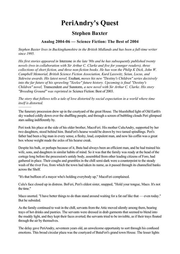 Campbell Memorial, British Science Fiction Association, Kurd Lasswitz, Seiun, Locus, and Sidewise awards. His latest novel, Exultant, moves his new “Destiny’s Children” series decisively into the far future of his sprawling “Xeelee” future history. Upcoming is final “Destiny’s Children” novel, Transcendent and Sunstorm, a new novel with Sir Arthur C. Clarke. His story