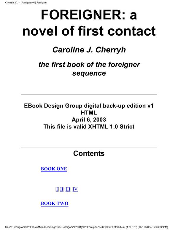 Book Preview novel of first contact the first book of the foreigner EBook Design Group digital back-up edition v1 This file is valid XHTML 1.0 Strict Cherryh, C J – [Foreigner 01] Foreigner |I| II| III| IV| V| VI| VII| VIII| IX| X| XI| XII| XIII| DONALD A. WOLLHEIM, FOUNDER 375 Hudson Street. New York. … Read more